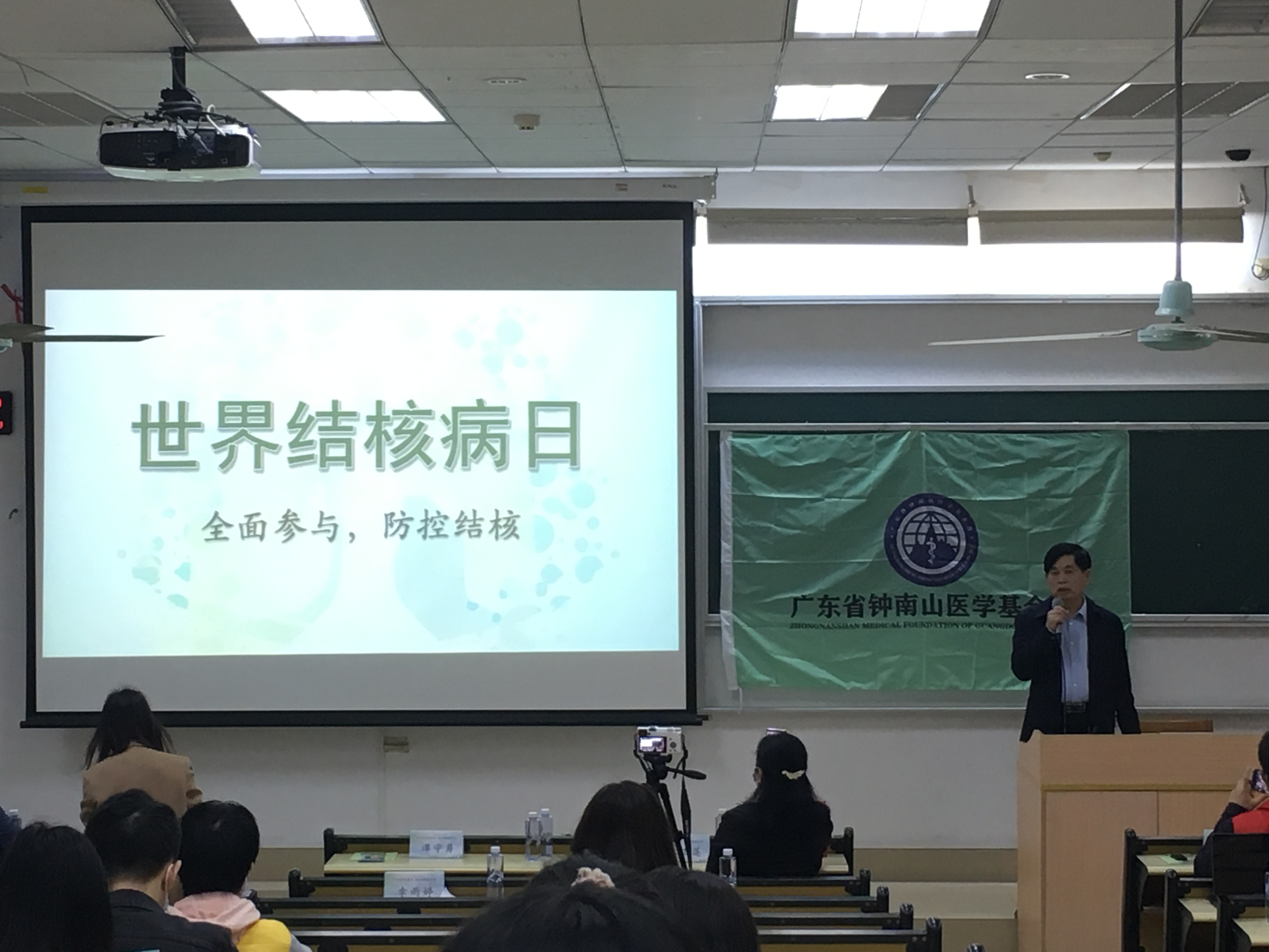 廣州大學分會場邀請了原廣州胸科醫院譚守勇院長出席結核宣傳活動,譚院長在現場給各位同學們介紹了學校結核病現狀,學校突發結核疫情的嚴重性以及大家平時應該如何預防結核,呼吁大家不要抽煙,飲食要營養均衡,多進行體育鍛煉,保證充足的睡眠。規律的生活能夠提高我們的免疫力,從而預防結核感染的可能性。