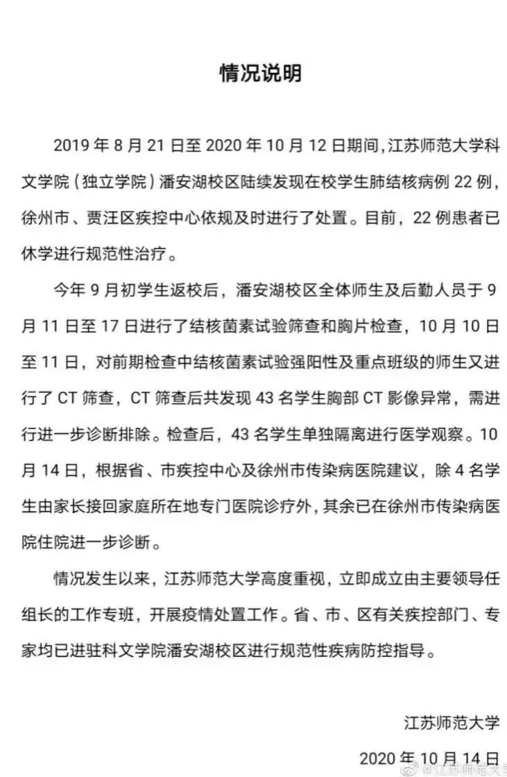 2019年8月21日至2020年10月12日期間,江蘇師大潘安湖校區陸續發現在校學生肺結核病例22例,患者均已休學并進行持續至少半年的規范抗結核治療。經重點篩查,另發現43名學生胸部CT影像異常,需進一步排查。