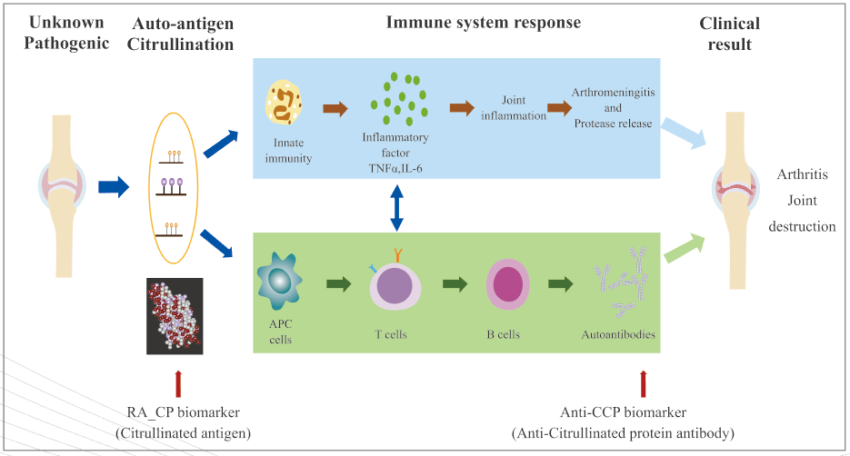 從2000年以來,除了國際公認的RA診斷指南中CCP外,一直未有突破性的高靈敏指標。我公司研發出最具潛力的RA血清學診斷新指標——RA_CP(類風濕關節炎瓜氨酸化蛋白檢測試劑盒),采用雙抗體夾心法測定人血清中瓜氨酸化類風濕抗原,這是根據抗原-抗體的出現時間先后,疾病發生原理設計和臨床大量樣本驗證了的一個檢測類風濕關節炎疾病的新指標。RA_CP對RA的檢測靈敏度85%-95%,特異性85%-95%,對于常規CCP檢測陰性的RA患者,RA_CP仍可檢出40%-50%(截至目前的數據是超過50%)。在CCP陰性患者中使用RA_CP可提高RA患者檢出率,提高臨床診斷類風濕性關節炎的準確性,顯著降低臨床漏診發生率,開展RA_CP檢測項目在臨床上可以更好地輔助RA診斷。